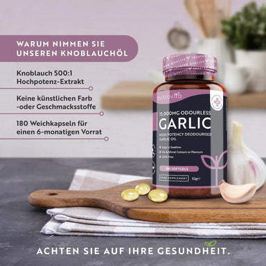 Mit 15.000 mg Knoblauch pro Weichkapsel - Jede Weichkapsel unseres Knoblauchsupplements enthält 30 mg desodorierten Knoblauchölextraktes mit intens...